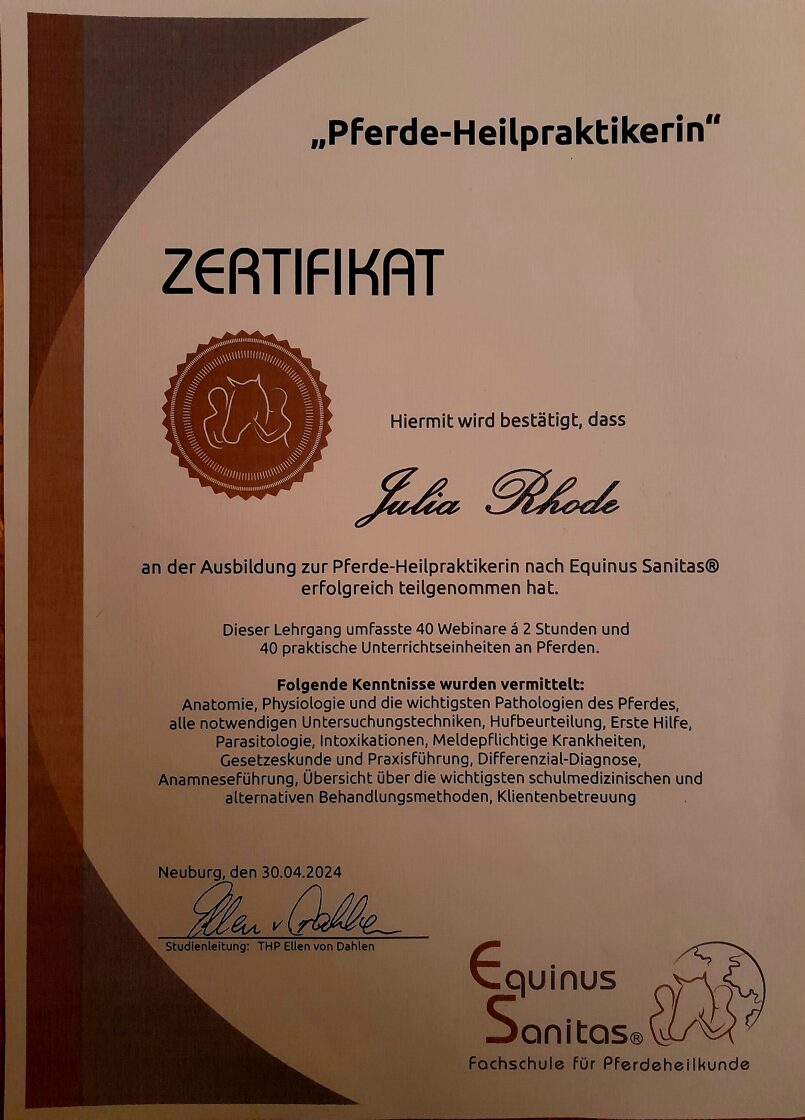 2014 begann ich eine Ausbildung zur Human-Heilpraktikerin an der Walter-Knäpper-Schule in Bochum, die ich jedoch abbrechen musste. 10Jahre später absolvierte ich die Ausbildung zur Pferde-Heilpraktikerin, praktiziere aber nicht als solche, sondern setze- falls gewünscht - Homöopathie ein.